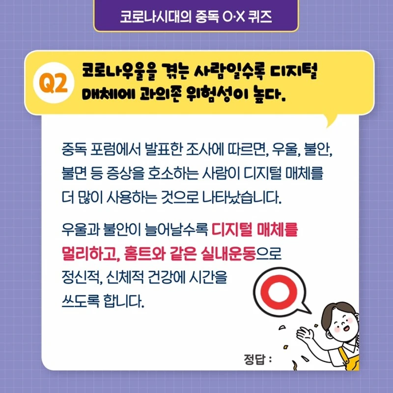 코로나우울을 겪는 사람일수록 디지털 매체에 과의존 위험성이 높다 (O)