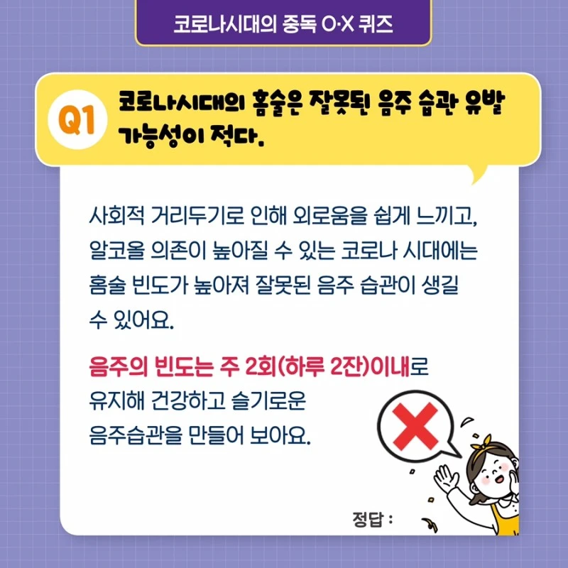 코로나시대의 혼술은 잘못된 음주 습관 유발 가능성이 적다 (X)