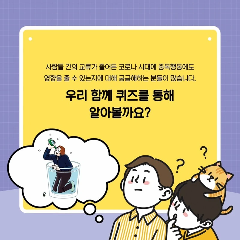 코로나로 인해 사람과의 만남, 취미, 여가 생활등의 단절되고 있는데요, 이러한 현상이 우리 인간의 중독행동에 어떠한 영향을 미치는지 한번 퀴즈로 알아볼까요?