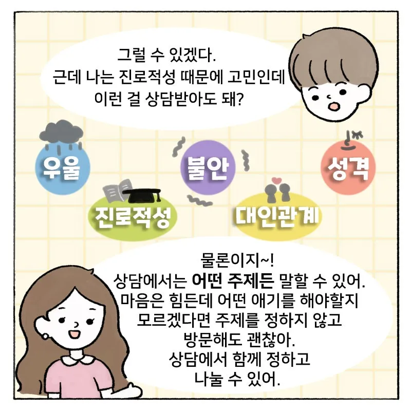 아래는 심리상담이 처음이어서 망설일 수 있는 분들을 위해 심리상담이 처음에 어떻게 시작되는지를 보여주는 내용입니다.