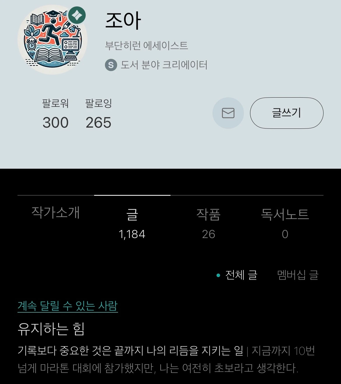 조회수에 연연하지 않겠다는 다짐은 글쓰기를 시작하던 때부터 지금까지 여전히 유효하다. 이 다짐은 달리기 훈련을 하며 페이스에 지나치게 연연하지 않겠다고 마음먹은 것과도 닮아 있다. 결과보다 중요한 것은 내가 해야 할 일을 꾸준히 해내는 일이라고 믿기 때문이다.