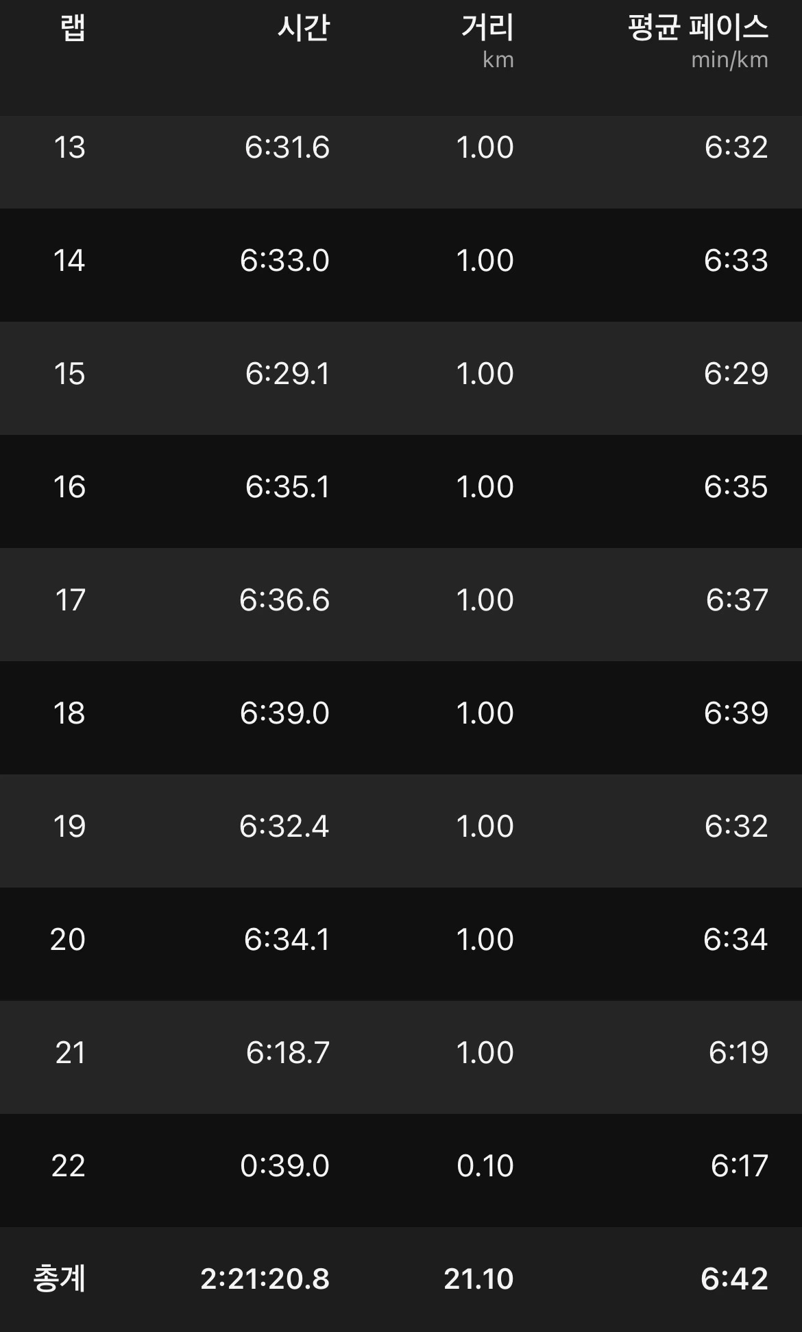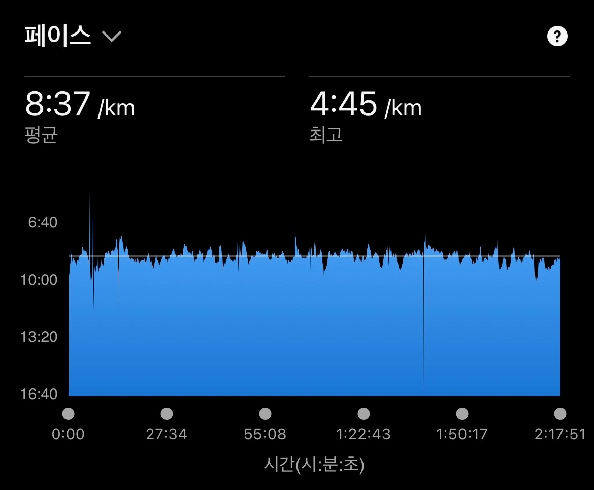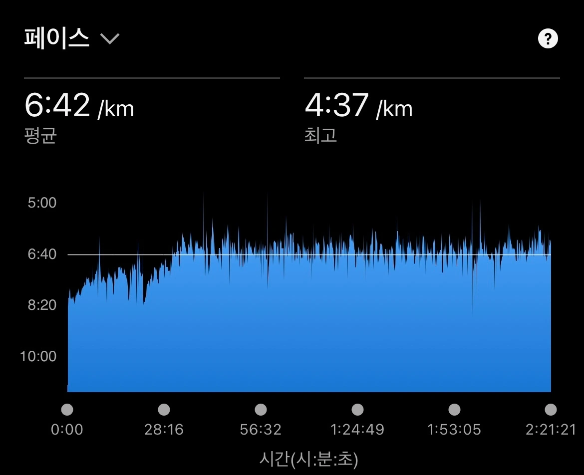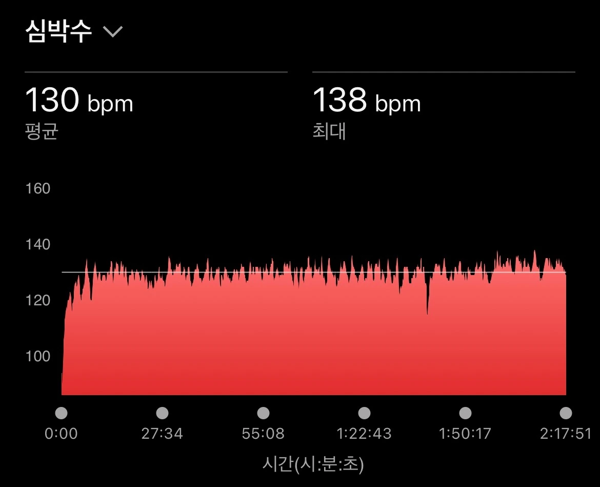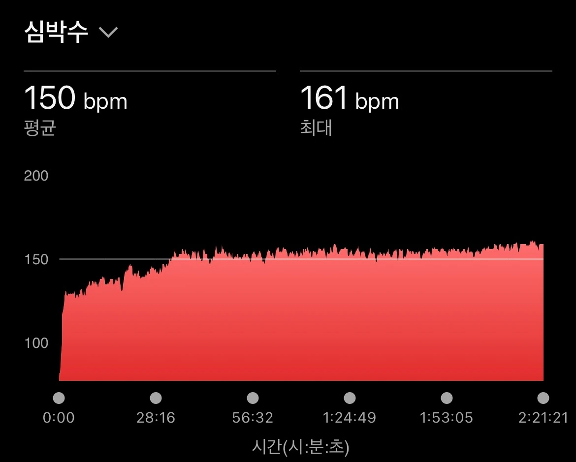 15km까지는 비교적 수월하게 페이스와 심박수를 유지할 수 있었다. 하지만 후반으로 갈수록 페이스를 붙들어 두는 일이 쉽지 않았다. 심박수도 조금씩 흔들렸다. 그럼에도 끝까지 페이스만큼은 놓치지 않으려 애썼고, 결국 계획했던 하프 훈련을 무사히 마칠 수 있었다.