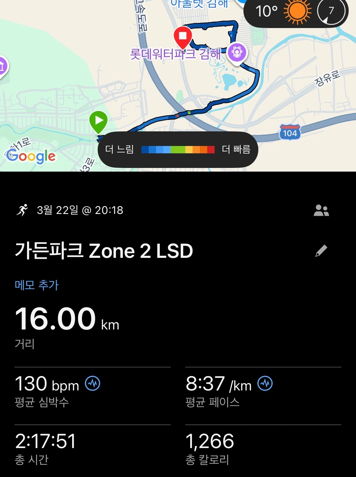 그 자신감은 곧 다른 궁금증으로 이어졌다. 이제는 Zone 2 방식으로 장거리 훈련도 가능하지 않을까. 그래서 일요일 저녁, 집 근처 공원에서 Zone 2 LSD 훈련을 진행했다. 거리는 16km였지만 아주 천천히 달렸기에 2시간이 넘게 걸렸다. 거리주라기보다 시간주에 가까운 훈련이었다.