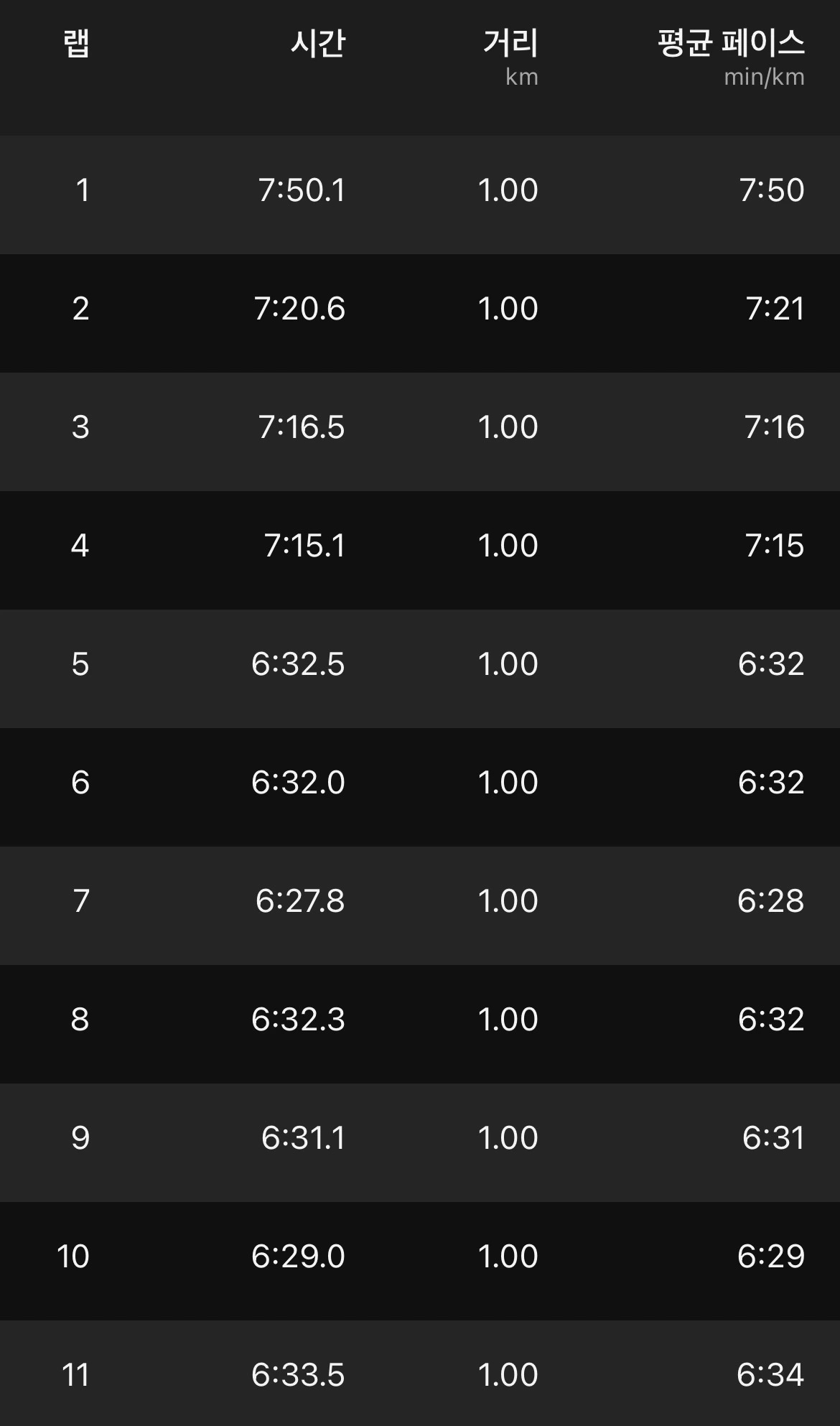 처음 4km는 7분 페이스로 가볍게 웜업을 하며 몸을 풀었다. 그리고 5km부터 천천히 페이스를 끌어올렸다. 몸은 생각보다 그 리듬을 기억하고 있었다. 아주 익숙하지는 않았지만, 전혀 낯설지도 않았다. 조금씩 몸이 페이스에 적응하면서 계속 달릴 수 있었다.