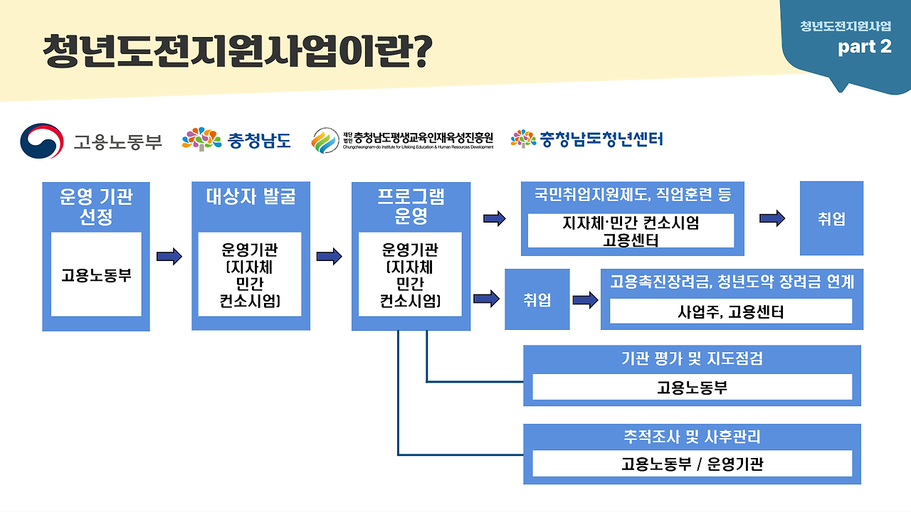 충남도청 청년정책과에 예산을 쓸 수 있는 시행업체를 문의하여 공모를 통해 '충남평생교육진흥원'에게 사업 시행을 위임하게 되었고