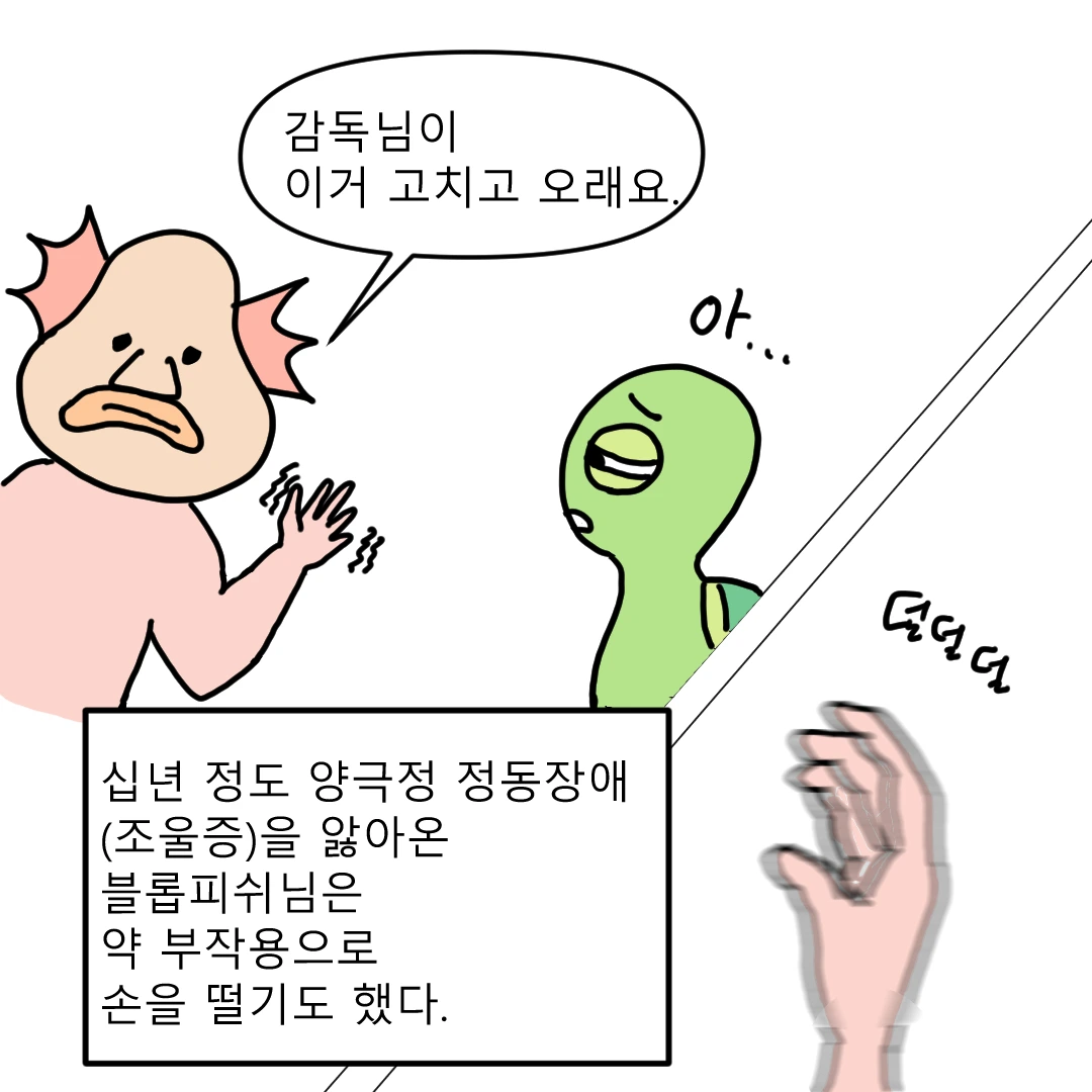 블롭님 말로는 조울증 진단을 늦게 받기도 했고, 치료과정에서 약을 과복용해서 손을 떠는 부작용이 생겼다고 했다.(블롭님의 말이니 의사의 처방이나 소견과는 상관없습니다.) 평소엔 손 떨림이 잘 보이지 않다가 유독 집중해서 만들기를 해야 한다거나 자신이 발표할 때마다 손떨림이 심해졌다.