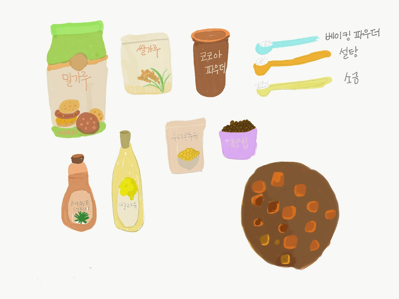 박력분 100g 쌀가루 30g 코코아파우더 10g 베이킹파우더 2g 설탕 30g 소금한꼬집 해바라기씨유 또는 카놀라유 여러 식물성 오일이면 가능 35g 두유30g 아가베시럽 30g 초코칩 30g
