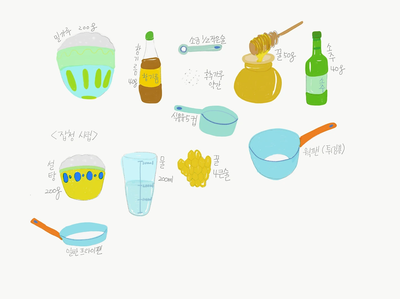 밀가루 200g 소금1/2 작은술 후추가루 약간 참기름 40g 꿀 50g 소주 40g 식용유 5컵