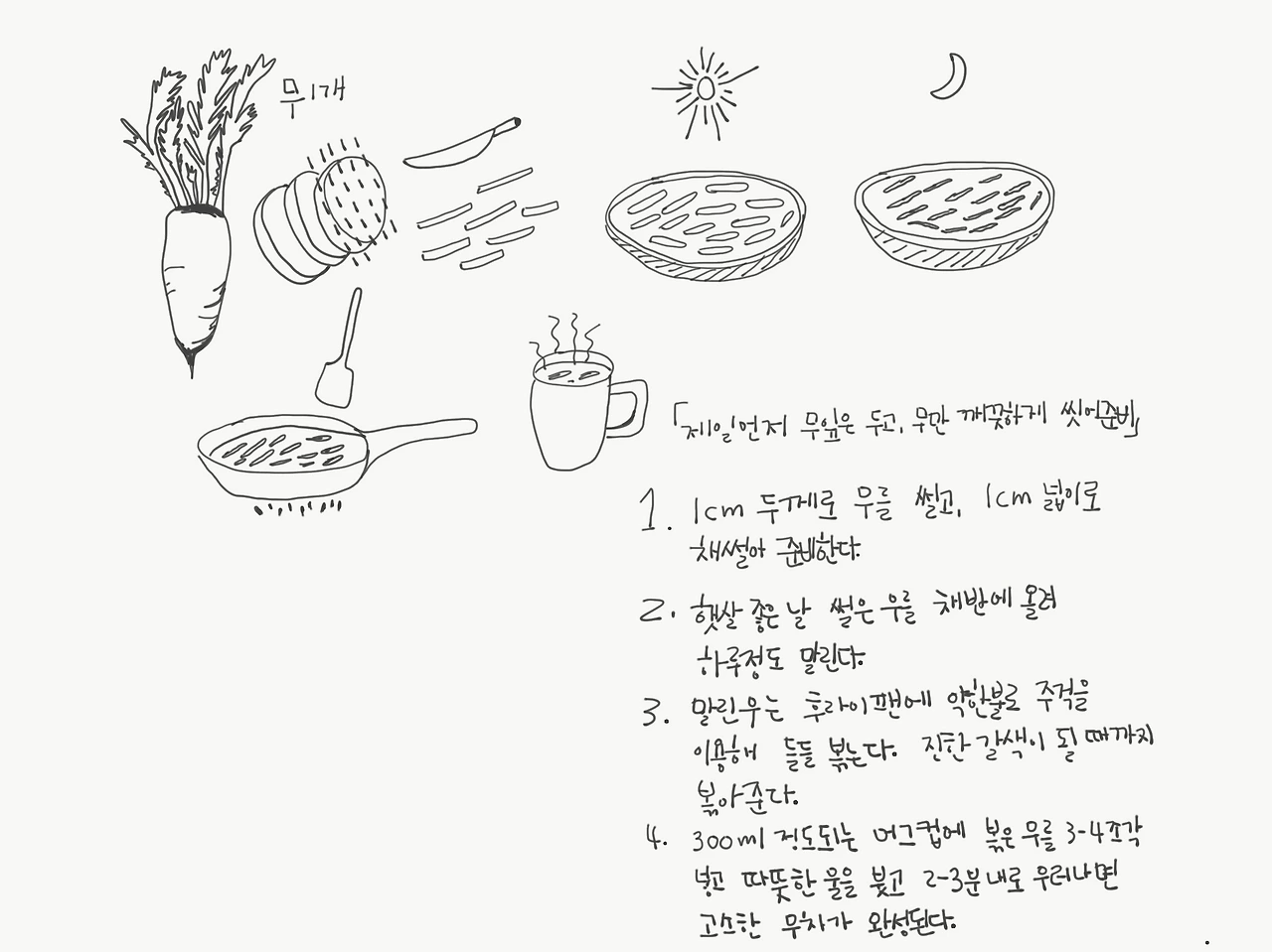 생각이 많을 땐 볶아 둔 무를 무심하게 툭툭 컵에 넣고 커피포트에 물을 올려 그 물이 끓어 오르는 소리가 너무도 잘 들리는 고요한 밤에 우려낸 무차를 양손으로 감싸안으며 마시고나면 내 생각이 조금이나마 정리가 잘 되었으면 좋겠다라는 바램으로 호호 불며 무차를 마신다.