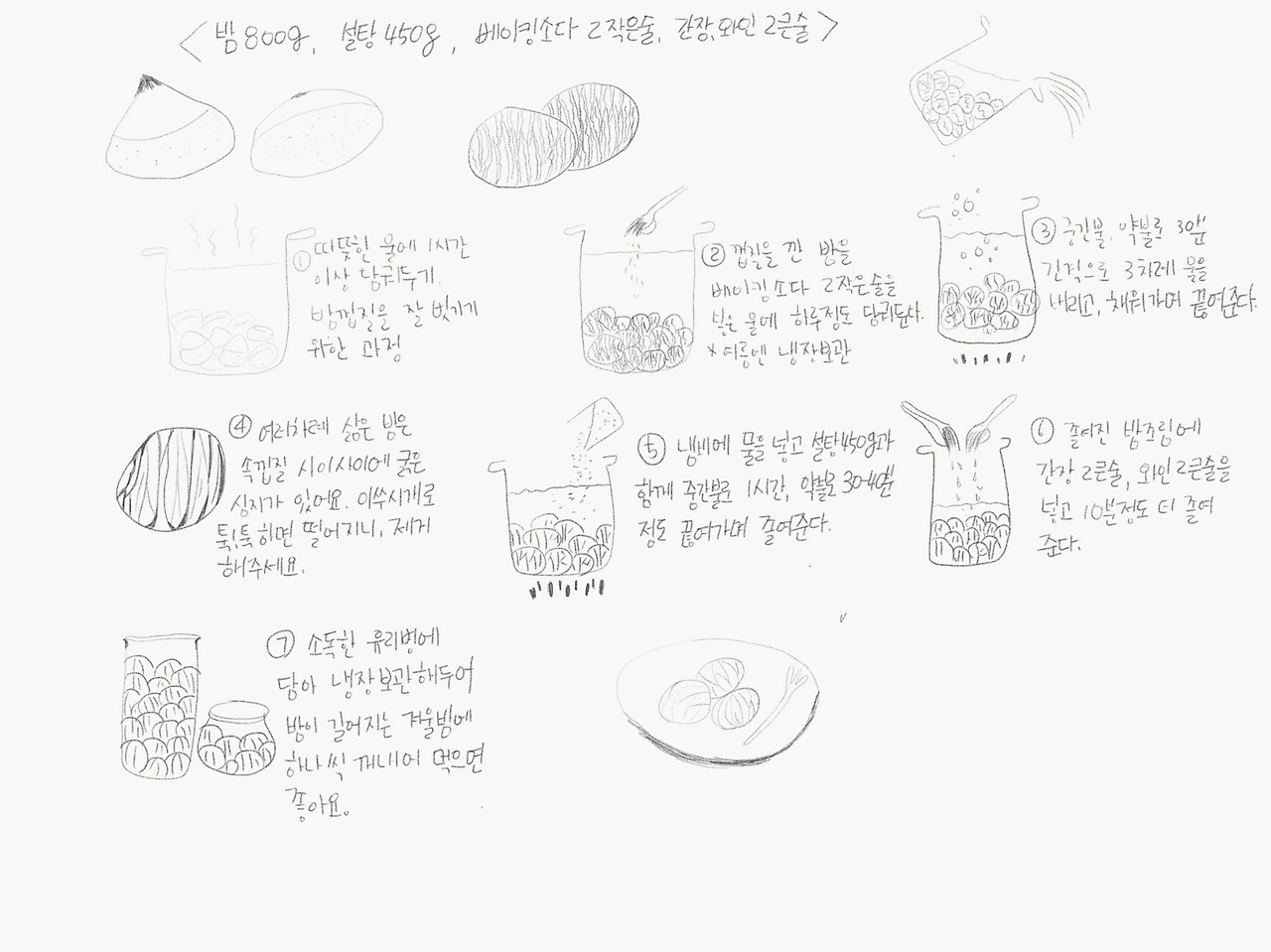 이 레시피로는 500g짜리 유리병 2개가 나온다. 소독한 유리병에 밤조림을 넣고 냉장고 보관 후에 지치고 힘든 날 하나씩 꺼내어 먹으면 달달하고 포근하게 하루의 피로를 풀어줄 수 있는 간식이 아닐까한다.