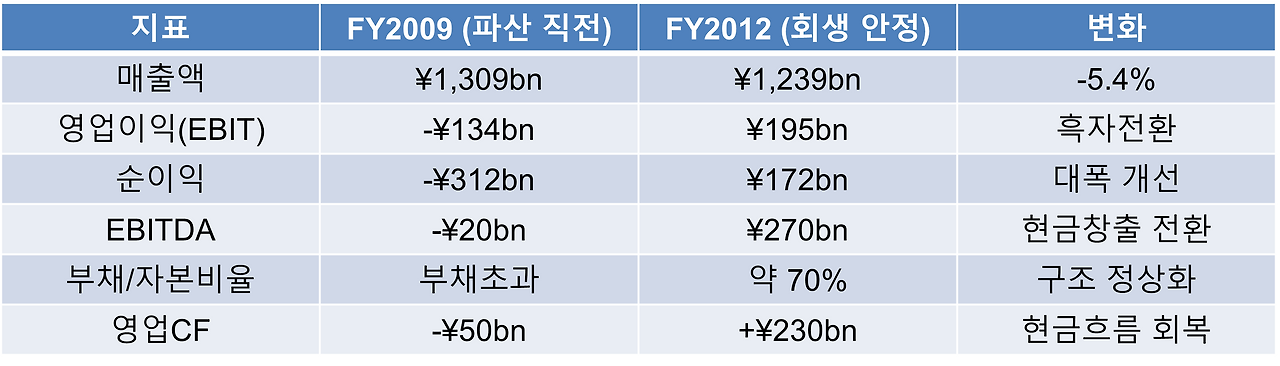 일본항공(JAL)은 2011년 흑자전환에 성공(영업이익 약 2천억 엔)하고 2012년 9월 도쿄증권거래소 재상장에 성공한다.(2024년도 흑자 기조 유지 중)