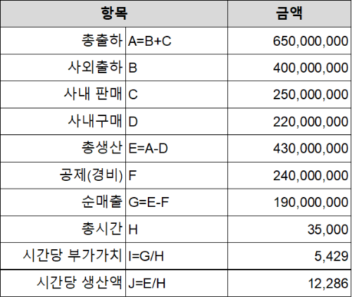 상기 예시에 의하면, 시간당 부가가치가 5,429이므로 만일 시간당 노무비가 3,429라면 2,000이 이익으로 회사에 남게 된다.