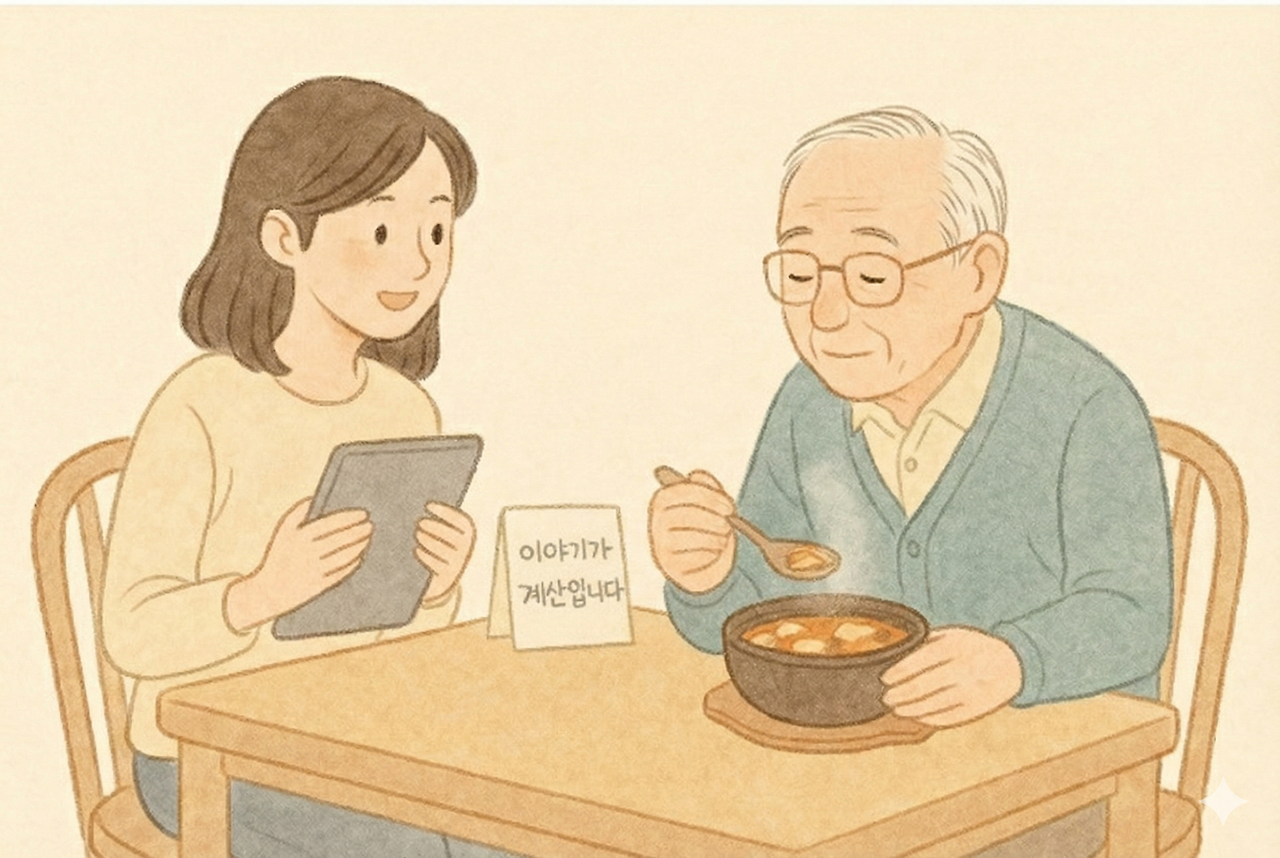 “어르신, 여기서는 주문 편하게 바꾸셔도 돼요. 대신 주문 마치시면 이야기 하나만 들려주세요. 오늘 여기 오는 길에 보셨거나 들으신 것, 한 가지만요.”