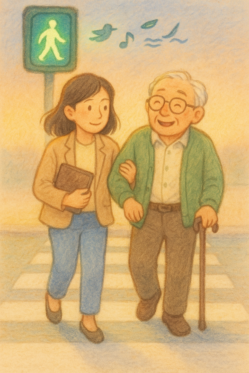 둘은 천천히 걸었다. 횡단보도를 건널 때, 신호음이 울렸다. 참새 소리였다. 이어서 빗방울 소리가, 그리고 파도 소리가 섞여 나왔다. 스마트 횡단보도는 그를 기억하고 있었다. 그가 좋아하던 소리들을 모두 불러냈다. 개인화된 음향 신호—수빈의 기록 덕분에 가능한 일이었다.