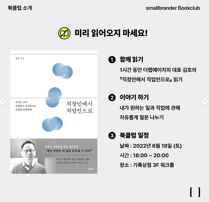 스몰브랜더가 북클럽을 연다는 게시물을 우연히 보고 토요일 오후 여섯 시 연남동으로 향했다. 막상 여섯 시가 다가오니 귀찮은 마음이 커졌던 건 사실이지만 ^^; 막상 장소에 도착해 한 시간 동안 똑같은 책을 사람들과 읽었을 때는 이보다 더 진귀한 경험은 없었겠다 싶었다.