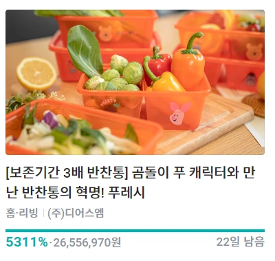 얼마 전 푸레시라는 팀을 만났다. 디어스엠이라는 회사였고 신소재 개발을 통해 신선 용기를 생산하는 브랜드다. 그들의 신선 용기는 특허기술을 갖고 있어 야채, 과일 등 남은 반찬을 보관했을 때 다른 제품들보다 훨씬 오래 보존기간과 신선도를 가져갈 수 있다.