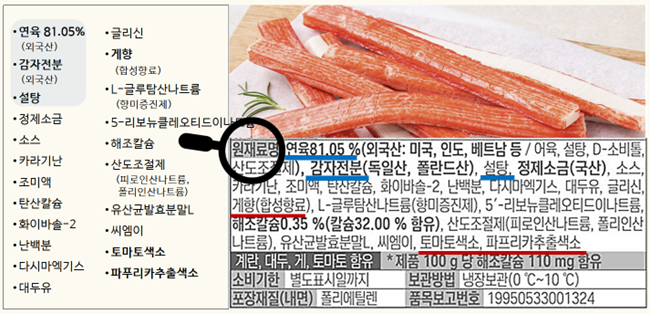 예컨대 게맛살 라벨을 보면(자료 1), 첫 번째는 연육(81.05%), 두 번째는 감자전분, 세 번째가 설탕.