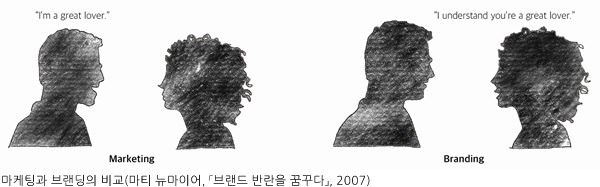 여러가지 의견이 있을 수 있지만 실무 쪽에서는 위 사진과 같이 이해하는 것이 일반적이다. 차이는 방향에 있다. 즉, 마케팅은 제품 생산자가 소비자에게 "나 이런 사람이고, 이런 일들을 했어" 하고 주저리주저리 떠드는 것이라면, 브랜딩은 소비자가 먼저 제품에 대해 "나는 네가 어떤 사람인지 알아. 너는 이런 일을 했고, 이런 사람이지" 떠올리게 만드는 것이다.