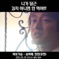 한편 요즘 뜨는 밈으로는 'OO가 말아주는 ㅁㅁ 아니면 안 먹는다고!'가 있다고 한다. '에스파가 말아주는 하이틴 아니면 안 먹는다고'라든지 '이승윤이 말아주는 사랑 가사 아니면 안 먹는다고' 같이 쓰이는 것. 출처는 뜻밖에도 20년 전으로 거슬러 올라 2004년 방영된 <미안하다, 사랑한다>에서 찾을 수 있다. 극중 소지섭이 했던 "네가 담근 김치 아니면 안 먹어!"가 흘러흘러 여기까지 도달한 것이다.