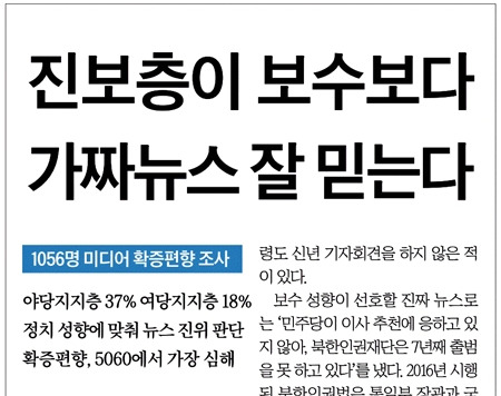 · 며칠 전 중앙일보가 '진보층이 보수보다 가짜뉴스 잘 믿는다'라는 굉장히 도발적인 제목의 기사를 1면 톱기사로 내걸었다. 여러 의미로 놀라운 일이었다. '진보층'으로 묶이는 국민들의 스펙트럼은 '보수층' 못지 않게 넓을 터. 이 모호한 두 집단을 자신있게 솎아내 비교하고 '진보가 보수보다 어떻다'며 유의미한 결과까지 도출해낸 것이기 때문이다.