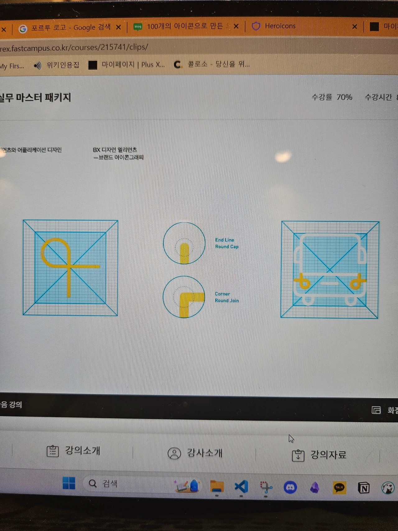 가령 UI용이라면 선의 웨이트를 낮춰 가시성을 확보하여야 하고 앱용이라면 브랜드 컬러를 적극 활용하는 등 아이덴티티를 각인시키려는 노력이 필요하다. 착시에 따른 시각적 보정이나 기존 브랜드가 가지고 있는 디자인 자산을 아이콘에 녹이는 스킬들(곡선, 기울기 따위를 아이콘의 포인트로 활용)도 더러 있으나 그래픽 디자인 레벨이 낮은 나로서는 '소 잡는 칼'처럼 느껴지기도 한다.