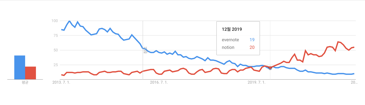 에버노트는 쭉 하향곡선을, 노션은 쭉 상향 곡선을 그렸다.