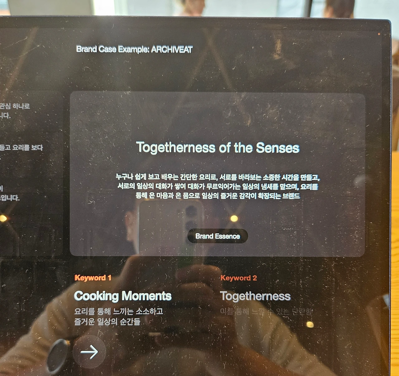 이런 세밀한 디테일들은 결국 큰 방향성에서 결정되는 것이고, 큰 방향성은 B.I.S(Brand Identity System)에서 나온다. 예를 들어 요리 플랫폼 <아카이빗>의 포토그래피 작업의 큰 방향성인 1) Cooking Moments와 2) Togetherness라는 키워드는 브랜드 에센스 'Togetherness of the Senses.'에서 착안한 것이다.