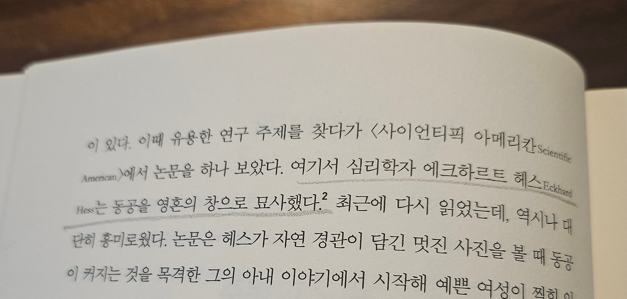 그 모든 정수가 담긴 이 책은, 러프하게 요약하면 인간 인지의 두 축, '시스템 1'과 '시스템 2'에 관한 책이다. 다른 말로 동공에 관한 책이기도 하다. 더하기를 할 때 동공(시스템 1)과 두 자릿수를 곱할 때 동공(시스템 2)은 다르다. 쉬운 문제보다 어려운 문제를 풀 때 동공은 더 커진다. '동공'으로 상징되는 인간 내부 인지 메커니즘을 해석하는 것. 그것이 이 책의 핵심이다. "동공은 영혼의 창"이다.