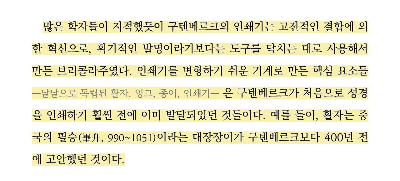 가령, 역사상 최고의 발명품으로 꼽히는 구텐베르크의 인쇄기는 나사형의 포도 압착기(press) 기술이 있었기에 가능한 것이었다. 애플의 아이폰 역시 새로운 기술 혁신이라기보다는 기존에 있는 기술들의 브리콜라주였다. 터치스크린? 휴대용 인터넷 기기? PDA가 이미 존재했었다. 아이폰은 이미 존재한 기술들과 감성을 융합한 결과물이었다.