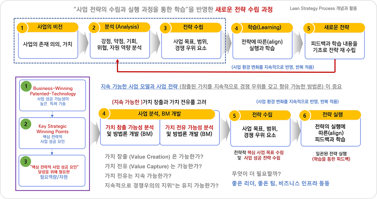 사업 전략을 수립하고 실제 실행 과정을 통해서 시장에서 검증하면서 얻어지는 새로운 사항들을 빠르게 반영해서 전략을 업데이트하고, 다시 실행하는 과정을 반복하는 것이 린 스트랫티지 (Lean Strategy) 개념입니다.