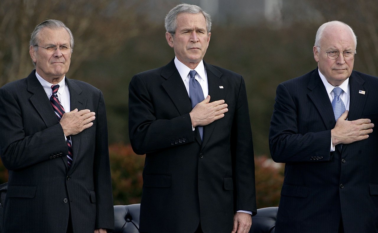왼쪽부터 도널드 럼즈펠드, 조지.W.부시, 딕 체니딕은 감명받은 듯 한동안 방문에서 눈을 떼지 못한다. 그는 럼즈펠드에게 묻는다. “힘, 잘 알겠어요. 그렇다면, 우리의 신념은 뭐죠?(우리는 어떤 신념을 기반으로 그 힘을 사용하나요?)” 잠시간의 침묵이 이어지고, 이내 대폭소가 터진다. 럼즈펠드는 세상에 별 미친 소리를 다 듣겠다는 듯 배를 부여잡고 낄낄댄다. 어딘지 부끄러워진 딕은 비로소 깨닫는다. 중요한 건 권력을 붙잡는 그 자체라는 사실을. 잡은 권력을 어떻게 사용해야 하는가와 같은 신념은 이 판에 아무 의미가 없다.