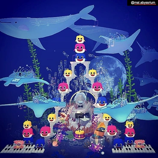 핑크퐁 아기상어 큐브 인형 확장물 이미지(위)와 게임 유저가 확장물로 꾸민 ‘핑크퐁 음악회' 화면(아래/ 출처: @mal.abyssrium). 컬러풀한 확장물을 유저 취향에 따라 다양하게 연출이 가능해 특히 반응이 좋았다.