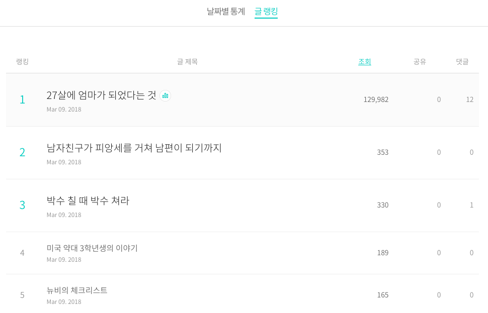 원래 아기가 통잠을 자는 편인데, 어젯밤 새벽 한 시쯤 깨서 조금 울다가 다시 잠이 들었어요. 아기 재워두고서 저도 습관적으로 옆에 있는 핸드폰을 괜히 한번 확인해보고서 잠에 드려는데, 브런치에서 알림이와 있지 뭐예요? 제 글이 조회수가 7천이 넘었다고. 이게 무슨 일인가 어리둥절해 있는데 몇 분 단위로 조회수가 몇 천씩 마구 올라가고, 글에 댓글도 달리고 구독자도 하나둘씩 늘고, 사람들이 이 맛에 SNS 하나 싶더라고요. 자고 일어나 보니 조회수는 처음 알림 확인했을 때의 10배인 7만이 되어있더라고요. 살면서 짧은 시간 안에 이렇게 많은 사람들에게 관심을 받은 것은 처음이라 조금은 무섭기도(?)하고 신기하기도 하고 그랬네요.