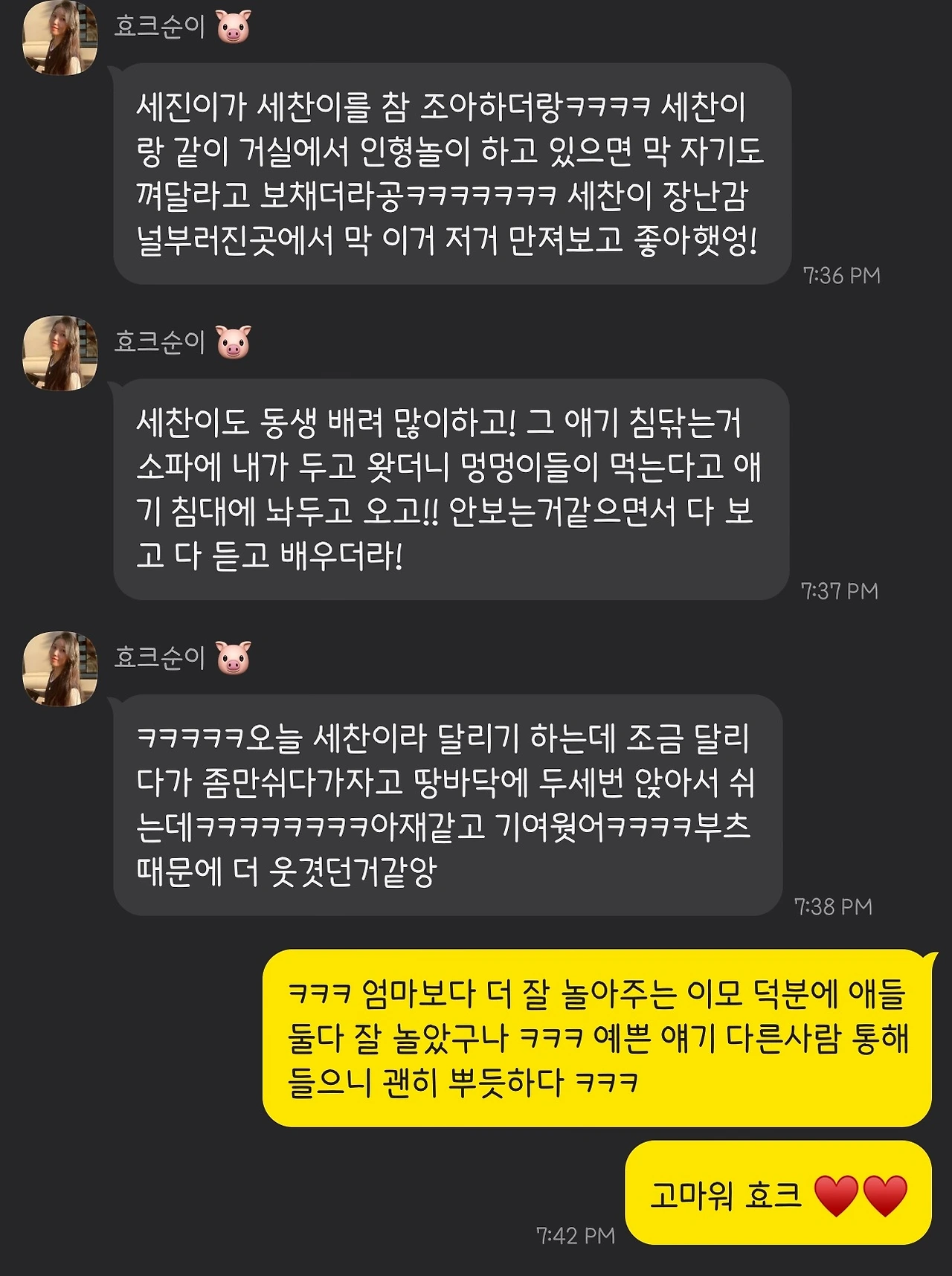 동생이 왔다가는 날이면 카톡으로 애들 어땠는지 후기를 들려주는데 뭔가 선생님 상담받는 학부모 마음 마냥 궁금하고 설레는 후기를 들려줄때가 종종 있다.