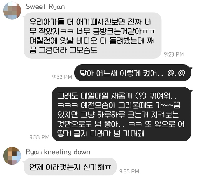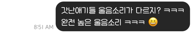 한국에서 중학교 때부터 알고 지내 온 친구가 있다. 고등학교 때 미국 오기 직전에 같은 반이었던 또 다른 친구가 있다. 그리고 미국 와서 미국 고등학교에서 만난 또 다른 세 번째 친구가 있다. 아무 접점 없을 것 같은 이 세 친구들과 나, 우리 넷에겐 지금 아주 큰 공통점 하나가 있는데 바로 같은 해(작년)에 첫아기들을 낳았다는 것이다. 공교롭게도 네 아기들 모두 같은 성별이다. 같은 나이에, 같은 해에, 같은 성별의 아기를 낳게 된 네 엄마는 카카오톡 채팅방을 만들어 매일매일 수다를 떤다. 살아온 방식도, 지금 사는 나라와 도시도 모두 제각각인 우리들은 (시차 때문에) 각자 편한 시간에 밀린 카톡 답변을 몰아하고, 각자 할 말도 몰아서 하는 편이지만 또 그 나름대로 우리 카톡 방만의 암묵적인 규칙을 즐기며 서로의 육아 이야기를 나눈다.