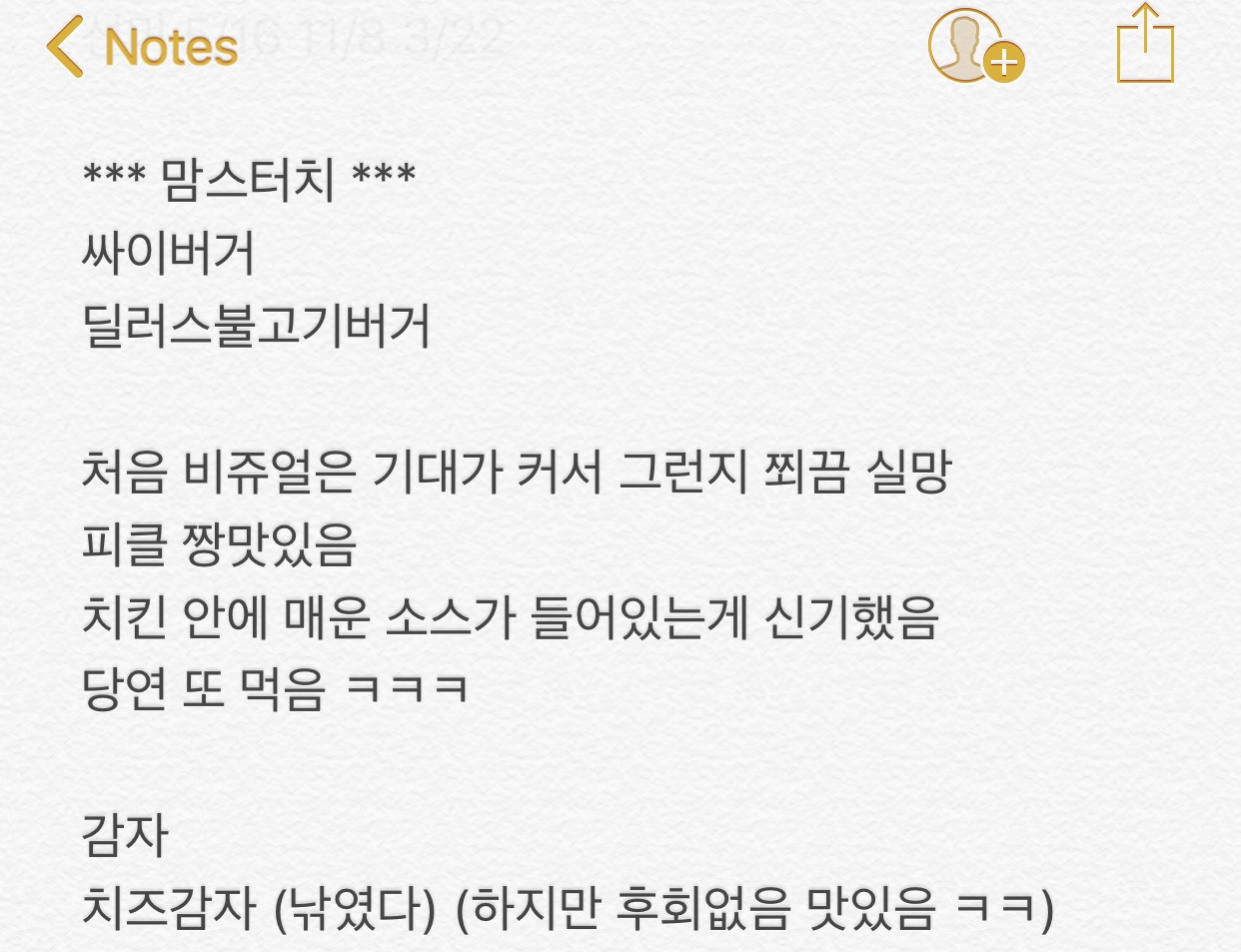 맘스터치 가서는 최대한 자연스러운 척, 외국에서 갓들어온 티를 안 내리라 다짐 했었는데 (디럭스 버거는 delux burger를 저렇게 써놓은거 같은데, 한국에 왔으니 한국어 표기대로 읽어야지! 한국어 발음 틀리지말자 이상하게 들리지말자 맘속으로 주문을 외우던 와중), 여기서도 음식을 “포장” 해가겠다는 말을 몰라서 “to-go로 주세요” 했다가 “네???” 하면서 놀란 아저씨를 볼수 있었다.