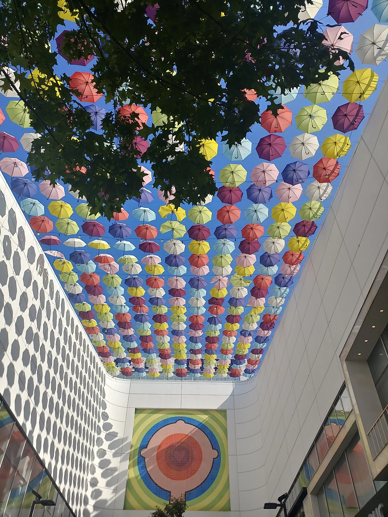 아들은 복합 쇼핑몰 '트리플 스트리트'주차장으로 들어선다. A동에서 D동까지 네 개의 건물 사이사이 세 개의 거리로 이루어진 복합문화공간이다. 먹거리와 패션, 키즈, 문화 공간이 들어선 건물 사이를 느적느적걷다가 햇살을 피해 그늘로 들어서 고개를 드니 하늘가에 다채로운 우산 수백 개가 살랑거린다. 청춘의 꿈처럼 비비드한 모습이다. 여름 열기와 세찬 빗줄기를 견디고도 엄격한 건축물 사이에서 감미로운 낭만을 품고 있다.