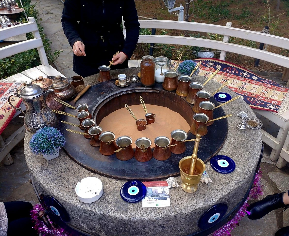 모래 위엔 이미 누군가 주문한 커피가 바글바글 끓고 있었다. 튀르키예식 커피추출법은 오늘날까지 이어지는 세계에서 가장 오래된 제조법이다. 그 문화와 전통은 16세기 오스만 제국까지 거슬러가야 한다. 튀르키예식 커피의 추출 방식은 머신 커피와는 다르다. 황동 체즈베에 원두 가루(밀가루처럼 곱다)와 물을 넣고 뜨거운 모래나 불 위에서 끓이는 것이다. 간단하게 보이지만 들이는 공은 작품 수준이다. 거품이 올라오면 체즈베를 모래에서 꺼내 거품이 가라앉을 때까지 기다렸다가 다시 모래에 넣기를 3~4번 반복한 다. 괜히 유네스코가 인류무형문화재로 지정했겠는가.