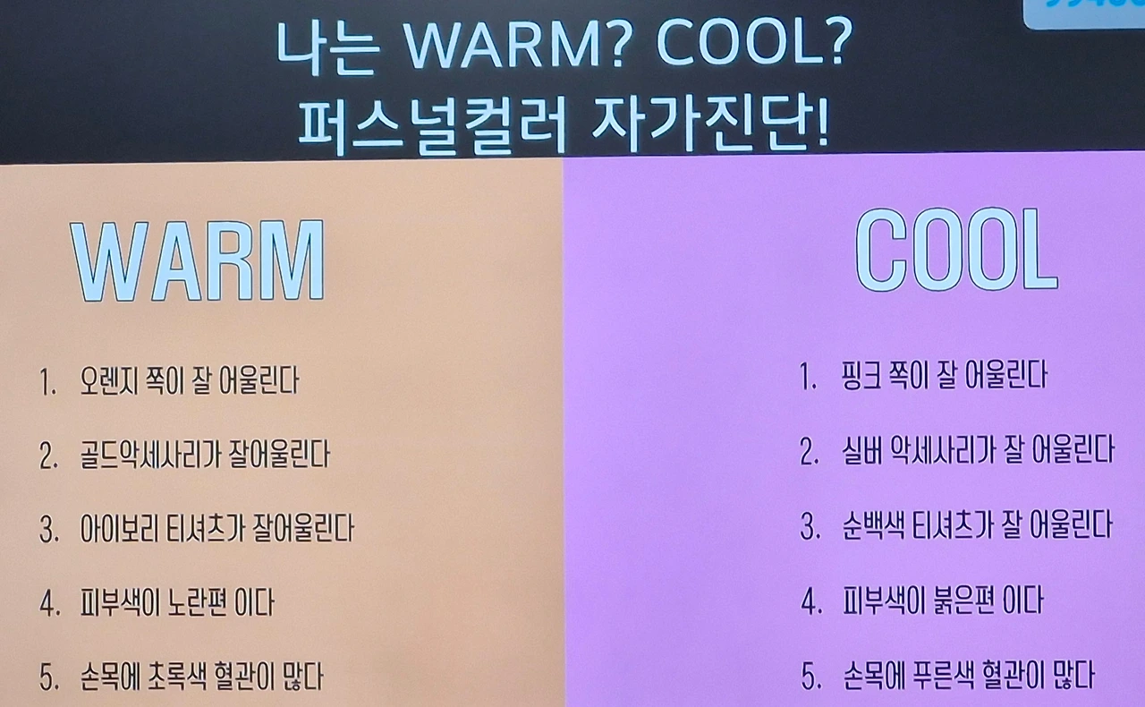 강의실에 도착하니 젊고 어린 여성들이 대다수였다. 수능을 마치고 참석한 열아홉도 있었고 저절로 빛이 나는 풋풋한 대학생도 있었다. 눈치 없이 신청했나 싶어 순간 멈칫했지만 철판 깔고 자리에 앉았다. 일단은 네 명씩 한 조가 되어 강사님이 나눠준 샘플로 서로의 컬러를 진단하기 시작했다. 핑크와 오렌지 색상 위에 각각 손을 얹으니 사람마다 화사한 정도가 달랐다. 누군가는 오렌지에서 손이 더 빛났고 누군가는 핑크에서 생기가 돌았다. 오렌지는 웜톤, 핑크는 쿨톤 타입에 해당된다. 옐로 베이스는 웜톤, 블루 베이스는 쿨톤이라고 설명하면서 피부에 노란 기운이 돌아도 쿨톤이 어울릴 수 있다고 했다. 결국 전문가의 진단이 필요한 영역이란 걸 명확히 강조한 셈이다.
