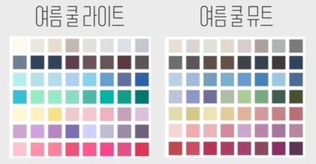 가을 웜 뮤트(컬러 2)와 여름 쿨 뮤트(아래)는 순색에 회색이 섞인 탁한 색상이 어울리는 타입이므로 대비가 큰 색상은 피하는 것을 권한다.
