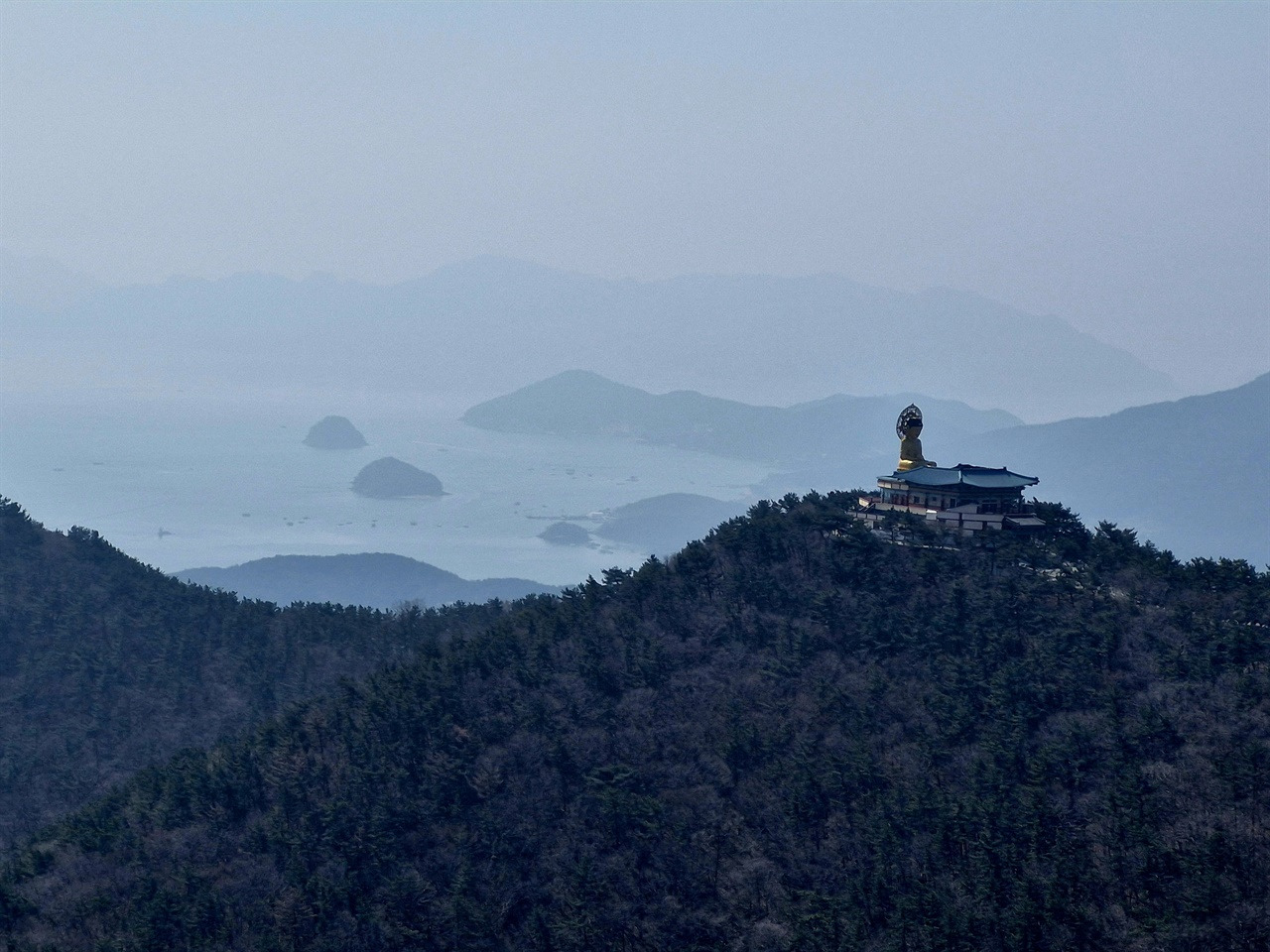 문수암 전망대에 서니 보현암 '금동약사여래불'이 멀리서도 시선을 제압한다. 수태산에 우뚝 솟은 모습이 장엄하고 거대하다. 약사불 뒤로는 남해 한려수도가 그림처럼 펼쳐졌다. 장관이 따로 없다 할 만큼 웅대한 광경이다.