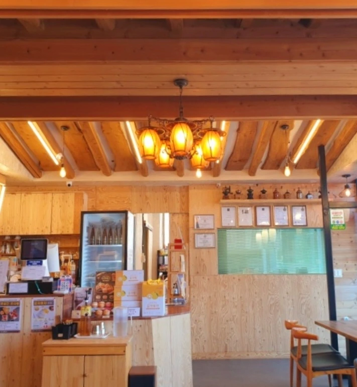 커피를 주문하고 기다리는 동안 카페 안을 둘러보니 아담한 규모에 깔끔한 진열이 돋보인다. 모던한 테이블 위에 달린 전구색 샹들리에를 따라가다 문득 서까래와 대들보가 만나는 고색창연한 천장과 마주한다. 지난 날과 오늘 날이 어우러진 차분한 분위기다.