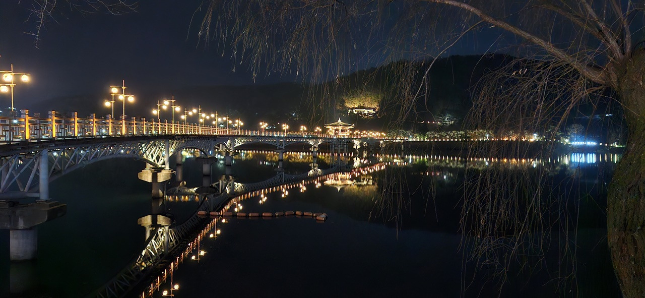 시간을 건너 월영공원(서쪽) 근처에서 저녁을 먹는 사이 수많은 조명이 월영교의 어둠을 몰아냈다. 낮에 보았던 예스러운 가로등은 풍등처럼 은은하게 빛났다. 12월의 밤 거린 싸늘했으나 낙동강에 비친 등불은 한없이 따사로웠다. 달빛마저 온전했다면 그 미관에 넋이 나갈 뻔했다.