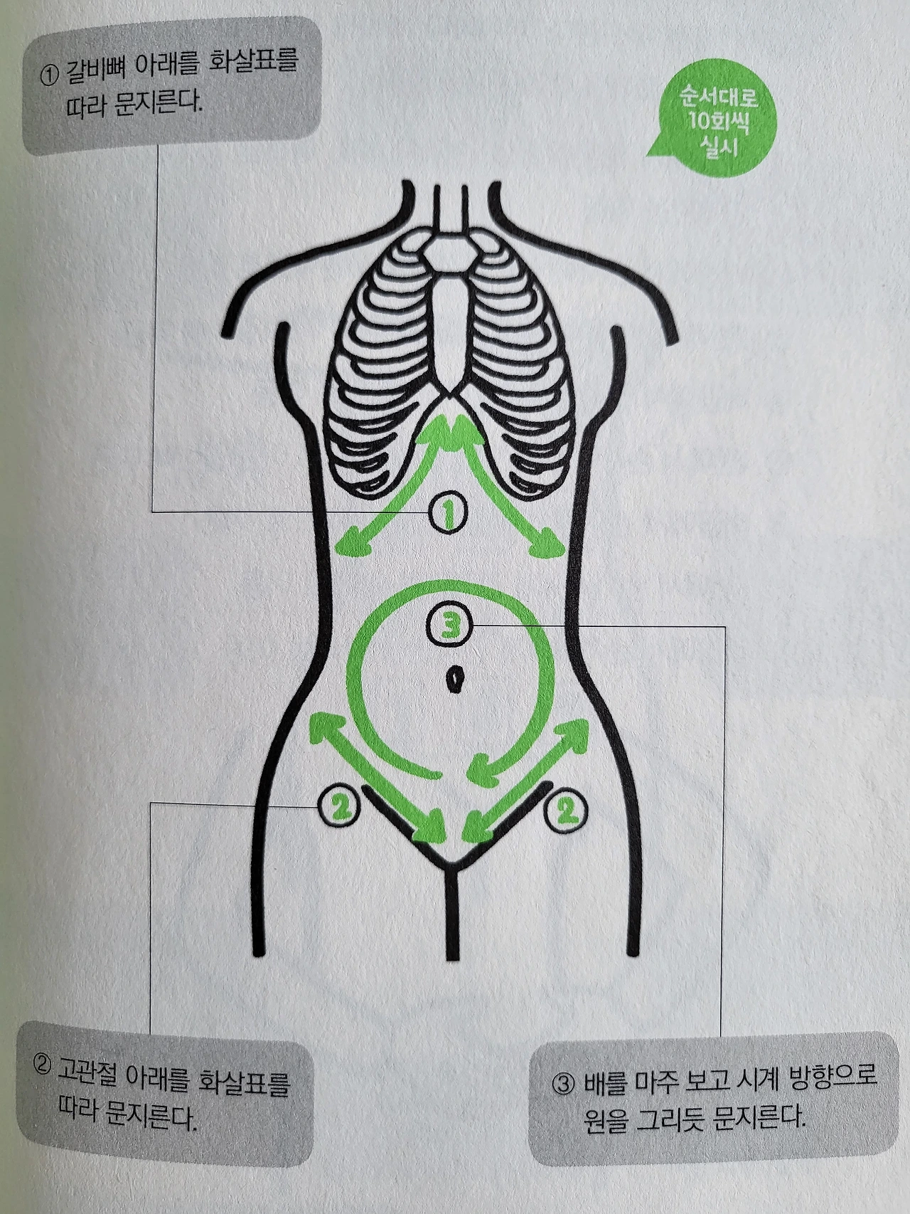 ㄱ.양손으로 좌우 갈비뼈(늑골) 아랫부분을 위아래로10회 문지른다.