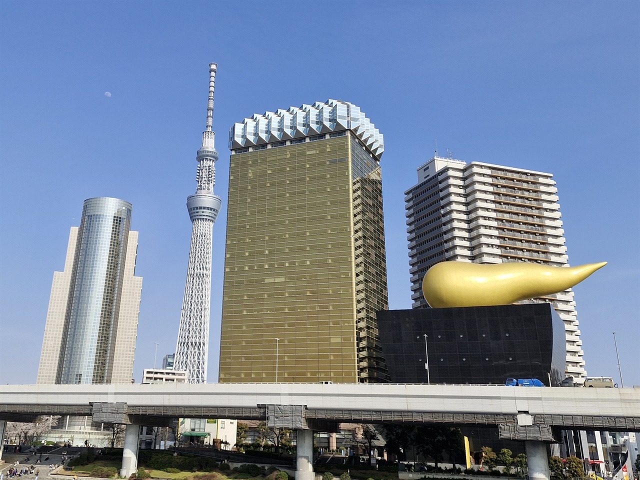 복잡한 센소지를 벗어나 '스미다강' 방향으로 나가면 '스미다 공원'이 조성돼 있다. 이곳은 벚꽃 명소로 3말 4초가 왕벚나무 벚꽃이 절정이라는데 흐드러지게 피진 않았다. 올 봄이 늑장을 부린 탓인지 이제 막 피는 중이었다. 벚꽃은 미미해도 삼삼오오 모여 앉아 봄을 누리는 현지인의 모습이 강을 따라 촘촘히 늘어섰다.