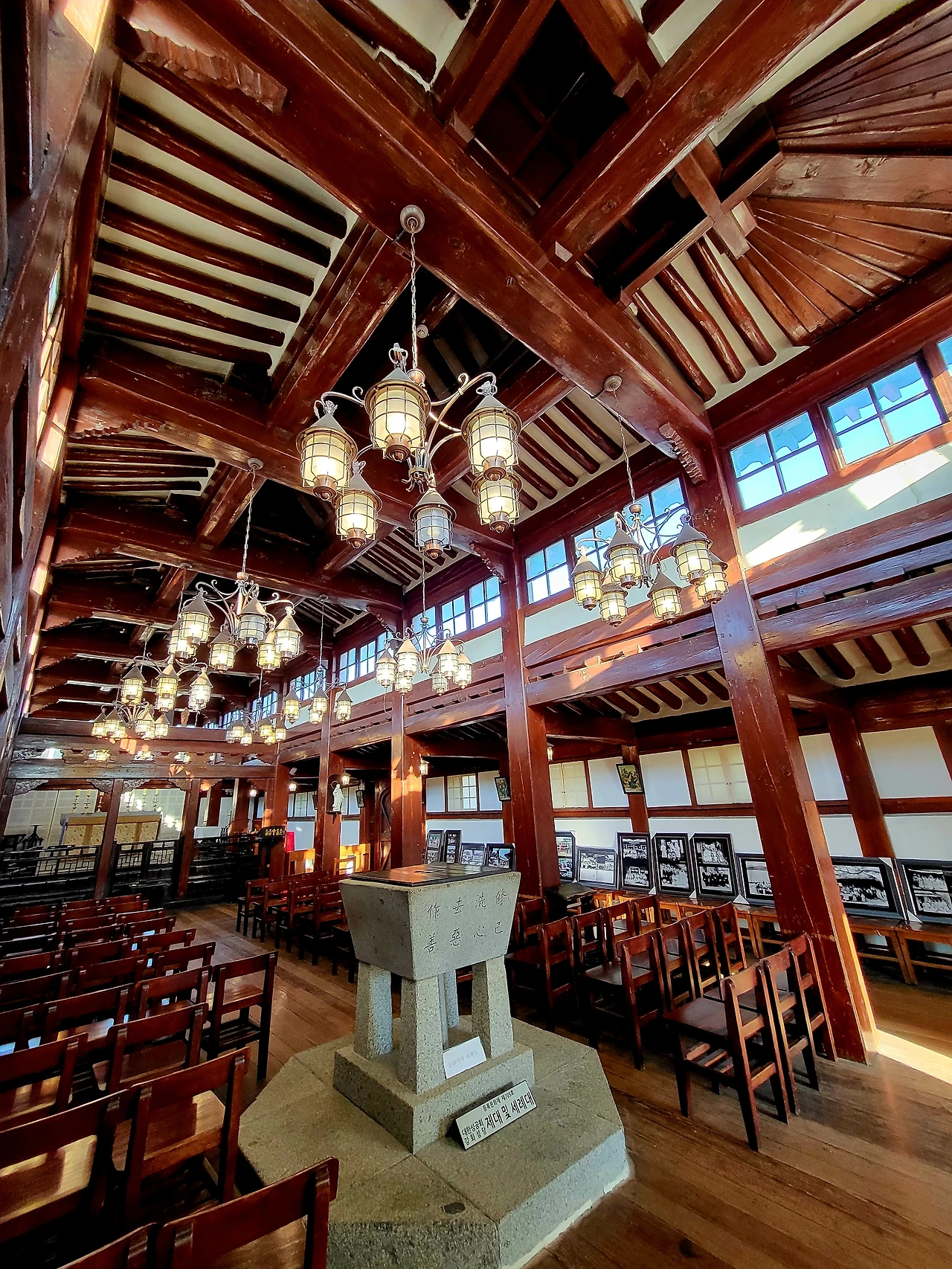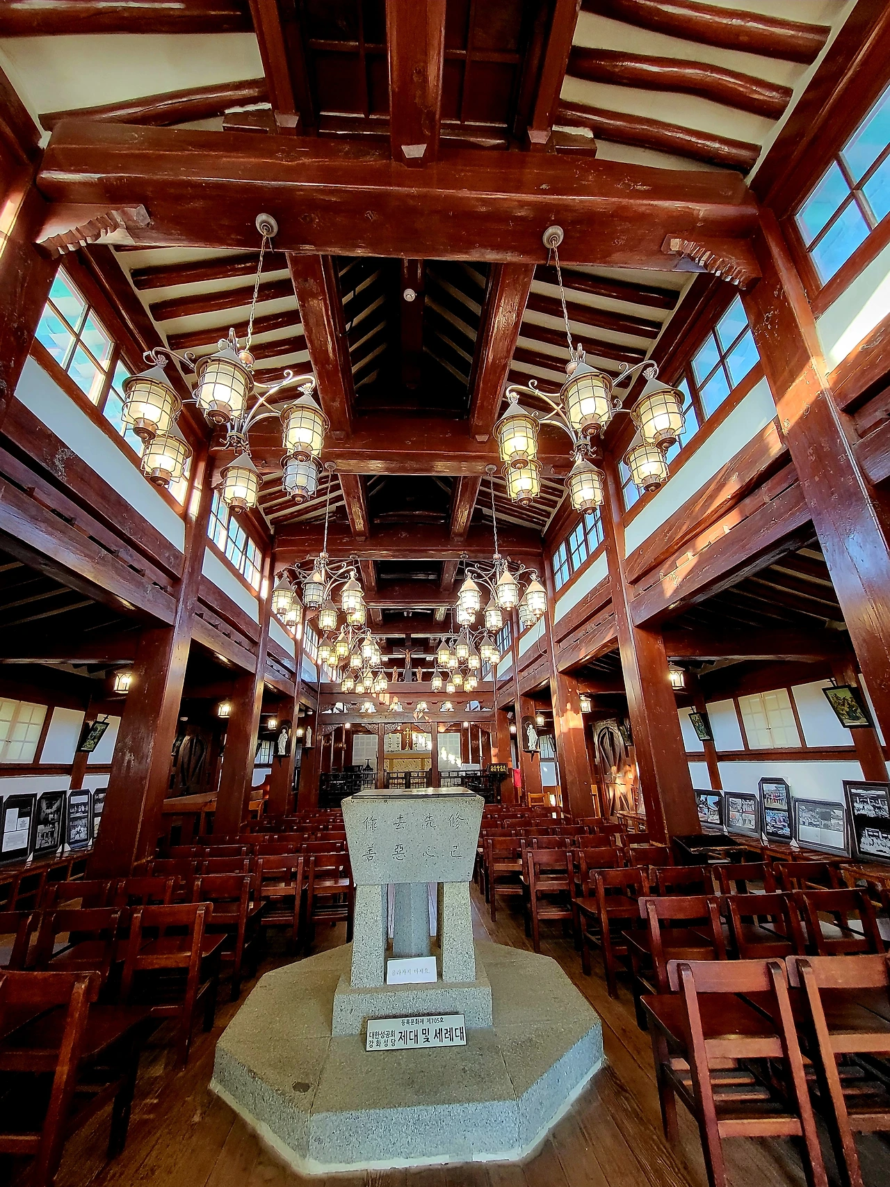 마룻바닥이어서 신발을 벗고 들어가는 방식이다. 양식은 동양, 공간은 서양이 혼재된 모습이나 편하면서도 성스러운 기운이 마음을 가다듬게한다. 마음이 고요해질 때까지 앞으로 나서지 못하고 뒤편에서 성당 안을 살핀다. 밖에선 2층인 줄 알았던 성당이 위아래가 하나로 트인 통층 구조라 천장이 꽤 높다. 천장은 서까래와 대들보, 도리가 설치된 한옥 양식이지만 조명은 샹들리에다. 단아한 샹들리에가 은은한 주백색을 퍼뜨리며 성당 인테리어의 꽃으로 피어난다.