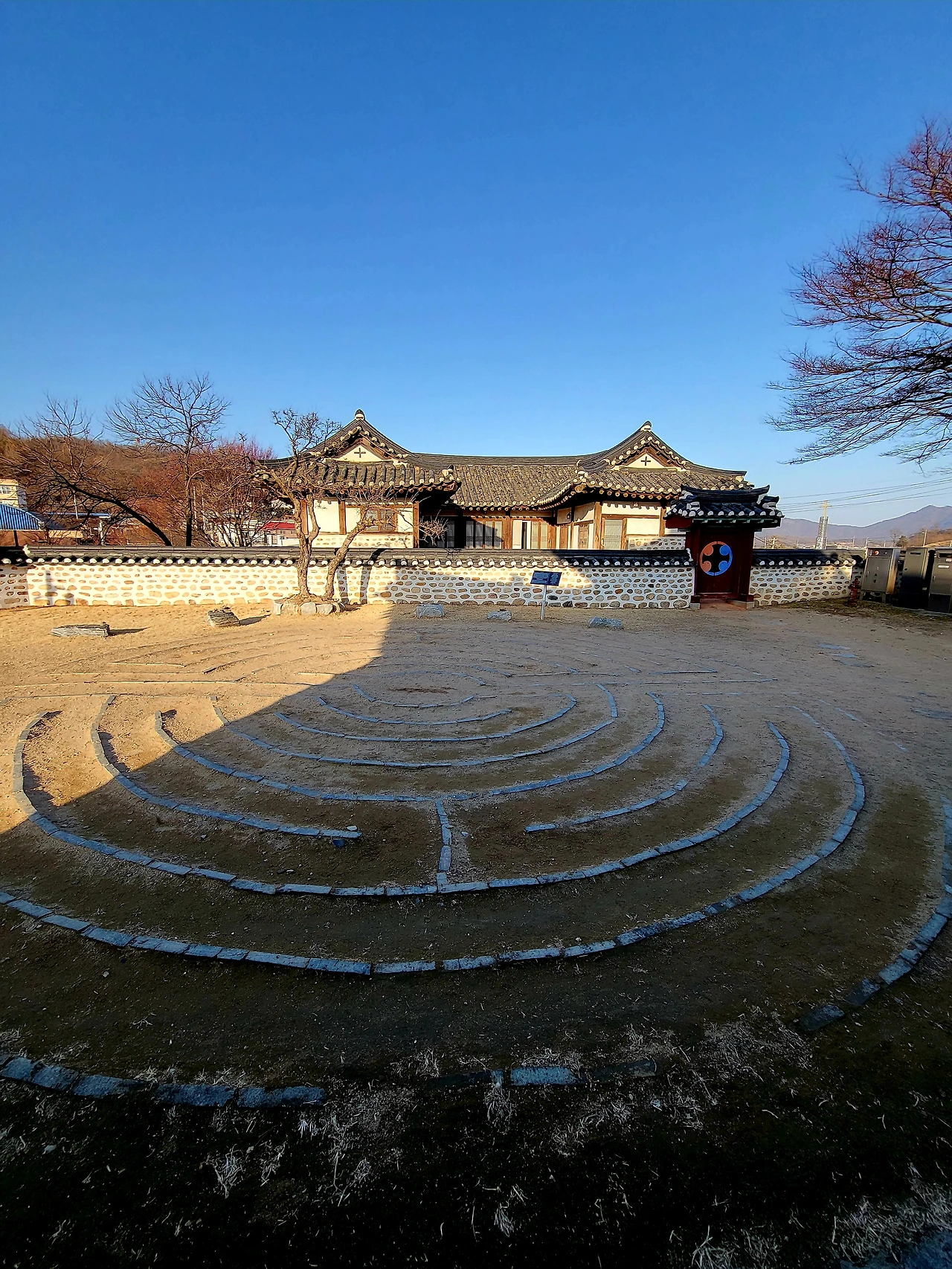 사제관과 성당 사이 마당엔 돌로 선을 그어 만든 원형의 미로가 있다. 어릴 적 달팽이집 놀이판과 흡사하다. '라브린스'라고 일컫는 영적인 순례길이다. 고대부터 전해오는 것으로 신전이나 오래된 성당에만 남아 있다. 명상을 하거나 기도를 드리며 중앙까지 갔다가 다시 돌아나오는 거란다. 성지 순례를 갈 수 없는 사람들이 라브란스를 걸으며 비우고 다스려 새로워지는 시간을 갖는길이다.