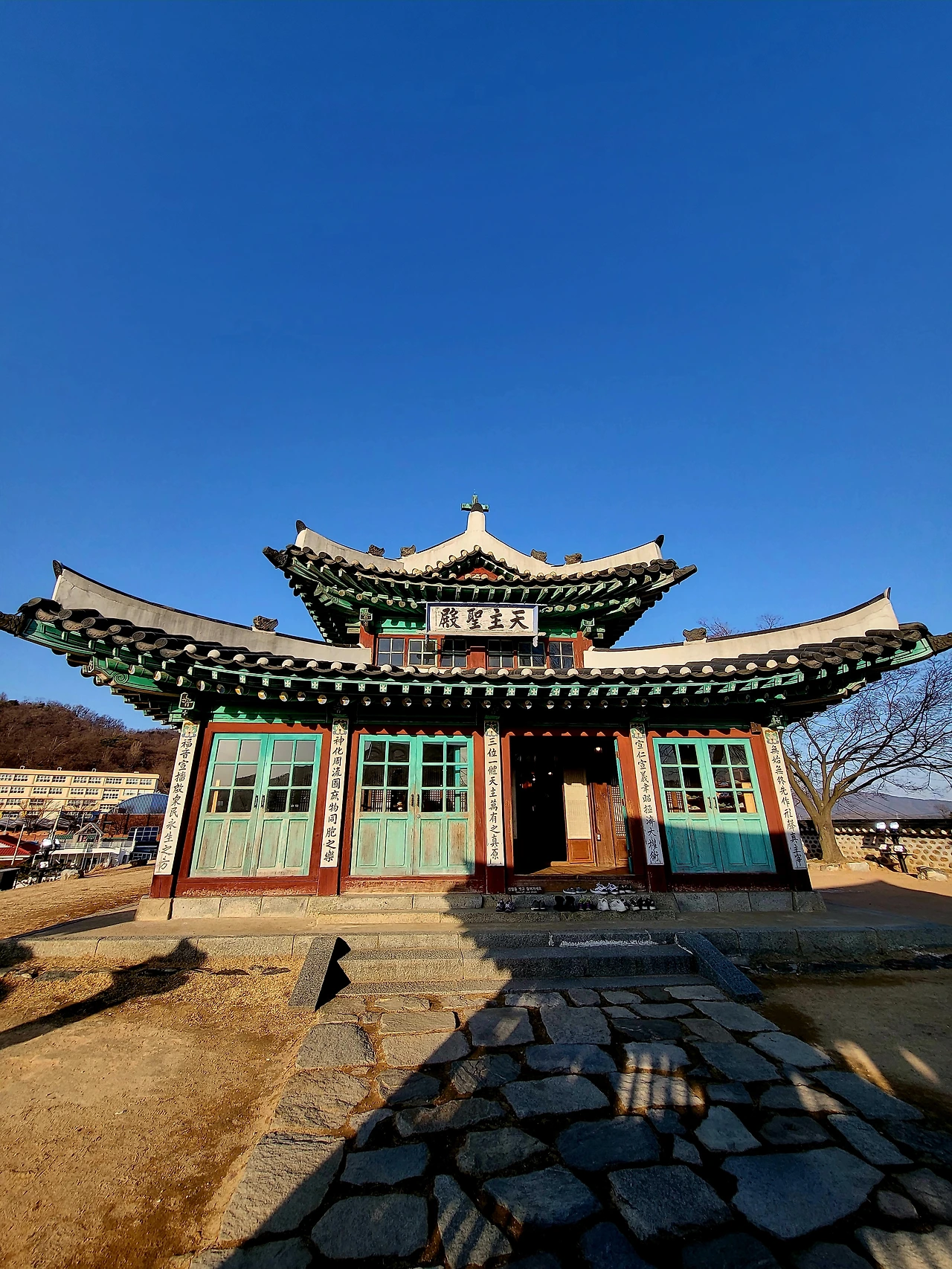 2층 창문을 성당의 상징인 스테인드글라스로 장식했다면 균형이 깨졌을 법한데 유리창으로 마감해 밝은 해가 내부로 스며들면 따뜻하면서도 경건한 예배당을 볼 수 있을 듯하다. 해가 비치면 그것대로 샹들리에가 켜지면 그것대로 성당 안은 거룩한 기도로 가득 찰 것 같다. 2층 창너머로 보이는 고운 단청도 성당을 새로운 눈으로 보게 한다.