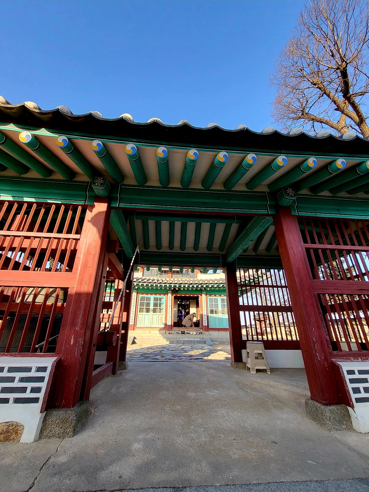들어선 쪽문 왼편의 아담한 한옥은 태극무늬를 연상시키는 적색과 청색 바탕에 십자가를 넣은 대문이 맞다문 입술처럼 굳게 닫혀 범접불가 의사를 전하는 듯하다. 자세히 보아 십자가네, 하기 전에는 언뜻 색채가 디미는 엄숙함이 감돈다. 나중에 알아보니 사제들의 생활관이었다.