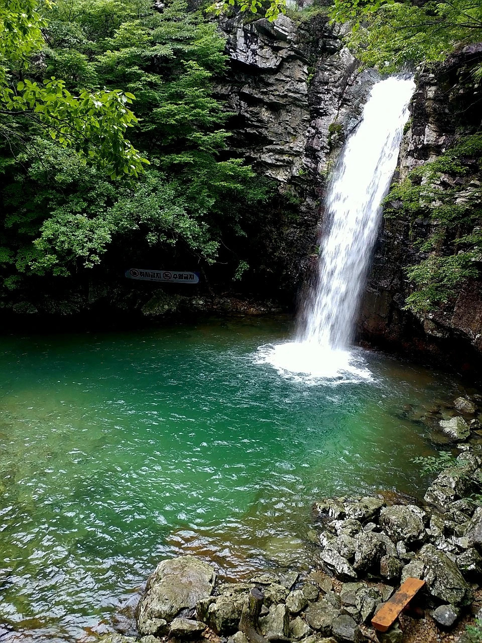 마지막 날, 구름이 먹을 가는 하늘가 사이사이 푸른 기운이 더 강해 우산을 둔 채 파래소 폭포로 향했다.그 옛날 기우제를 지내면 바라던 대로 비가 내렸다 하여 '바래소'에서 유래된 이름이란다. 올라가는 길은 나무와 구름에 가려 28호 파운데이션을 바른 분위기였다. 인적이 드물다보니숨소리까지 귀에 걸리는 예민한 숲길이었다. 짜그락 짜그락 거친 자갈길이었다 처벅 처벅 흙길이 잠깐 나타났다 텅텅텅 데크가 깔린 길을 지나 계단 수십 개 오르락 내리락 하니 숨은 비경이 나타났다. 1.3km라고 얕잡아 봤다간 코깨질 길이었으나 눈에 담아 갈 만한 가치있는 절경이었다.